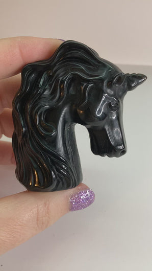 The Black Obsidian Unicorn Head Carving is a unique and elegant piece of art that features a unicorn head carved from black obsidian stone. This stunning piece is meticulously crafted, showcasing intricate details and a sleek design. Perfect for unicorn lovers or those who appreciate distinctive and mythical art pieces, this carving adds a touch of magic and whimsy to any space. Its striking appearance and quality craftsmanship make it a standout piece that is sure to be a conversation starter.